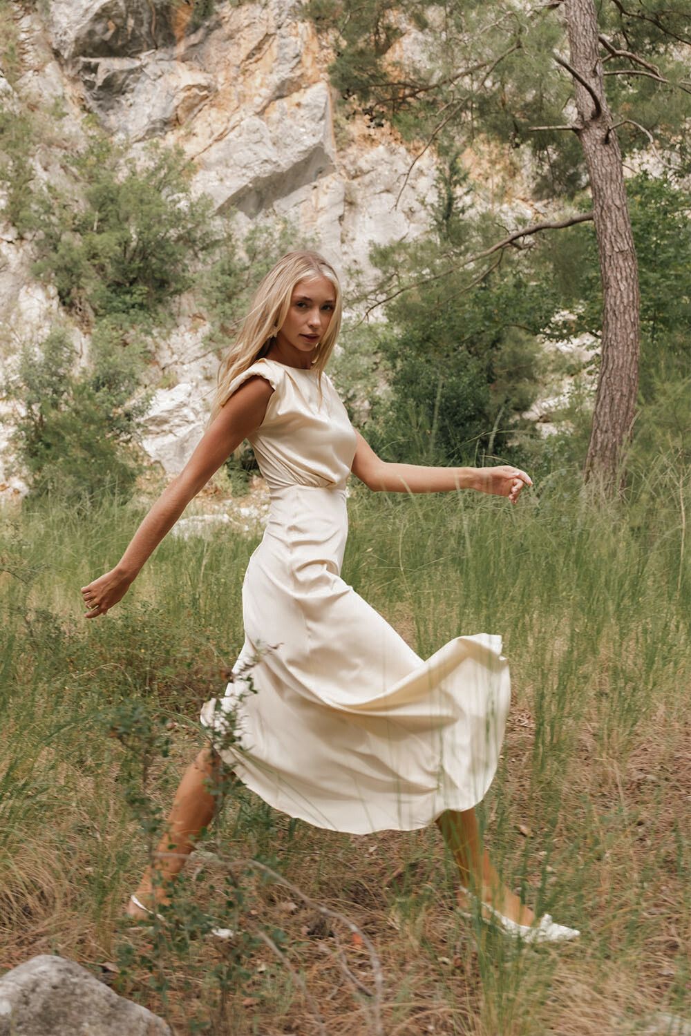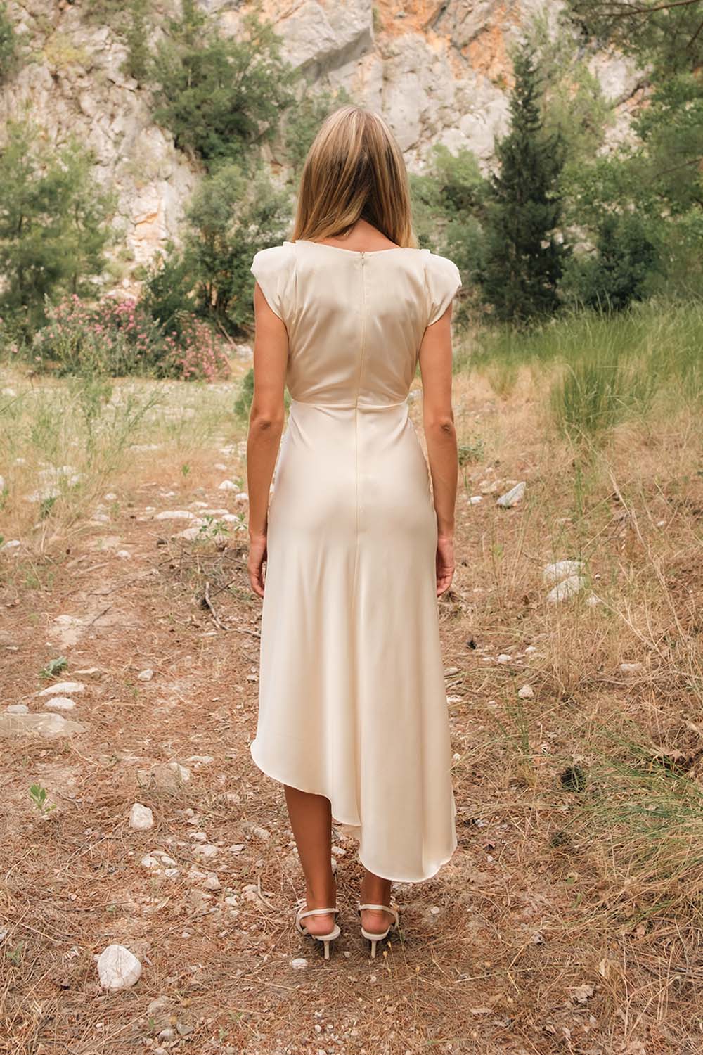 Fitted midi dress. Champagne White Matte Satin. Dry cleaning only. Long dress with slits. Padded shoulders. The dress is unlined and does not show through.