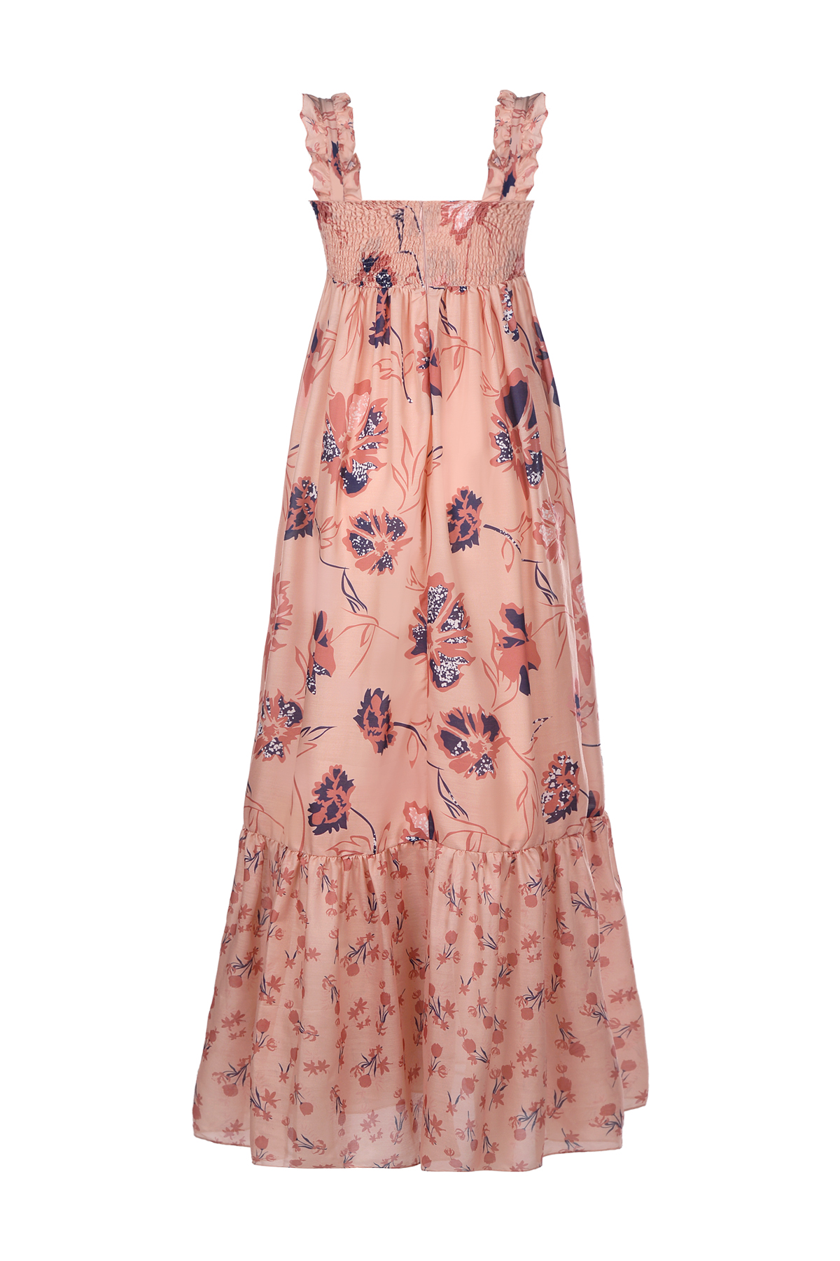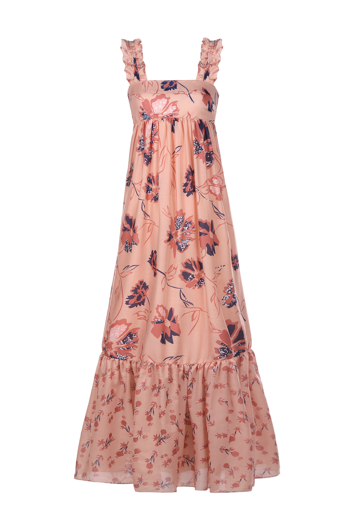 Fırfırlı omuz askıları ve midi sekilde gelen bir elbisedir. Kare yaka elbisedir.