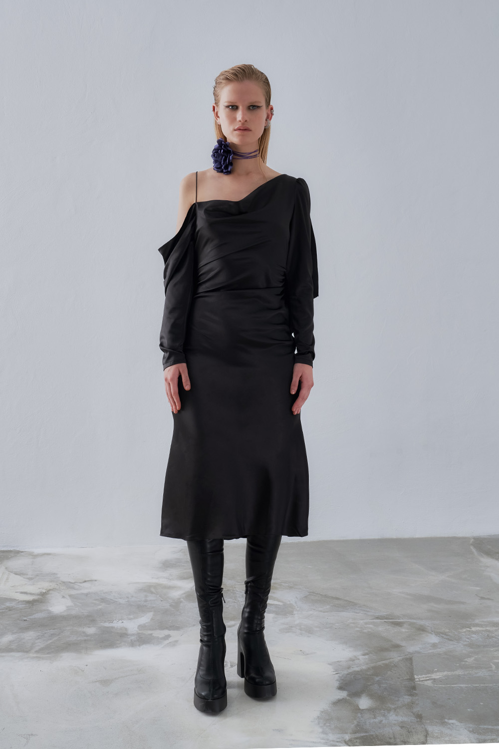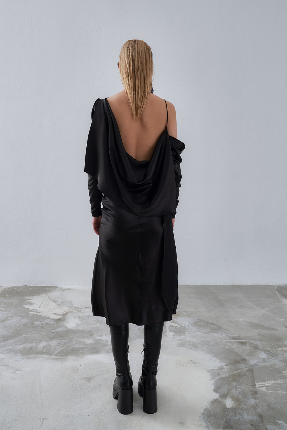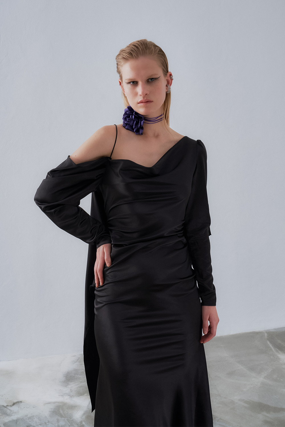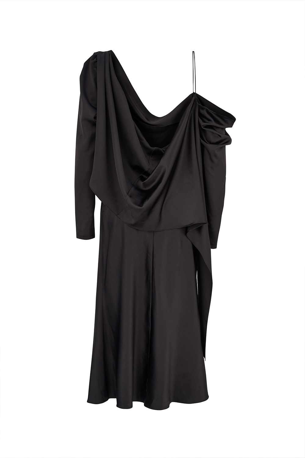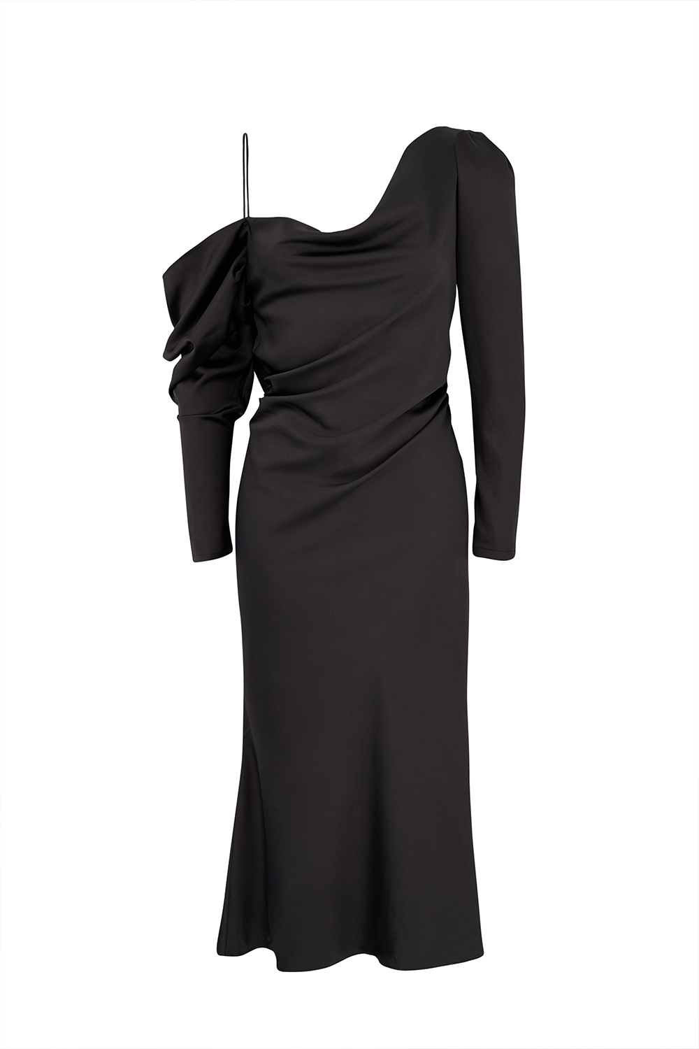 Matte satin black color – Does not show through – The front collar comes in the form of a grage. – The back back of the skirt is completely open and comes with an asymmetrical flywheel. – The right sleeve comes in the form of a drape and continues as a free flywheel. – The waist line of the skirt is shirred. – It is a bevel cut dress. – It comes with one shoulder strap and has additional fabric that comes up to the thin long waist.
