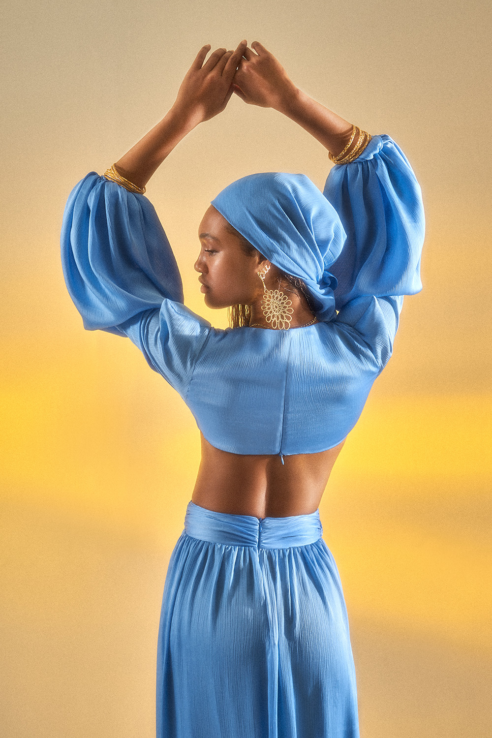 Uzun kollu ve V dekolteli elbisedir. • Bebe mavisi renktedir. • Yan ortada yırtmaç vardır. • Cut-out. • Bel ortası asimetrik kesimdir. • Astarlıdır. • Bele oturan kesimdir.
